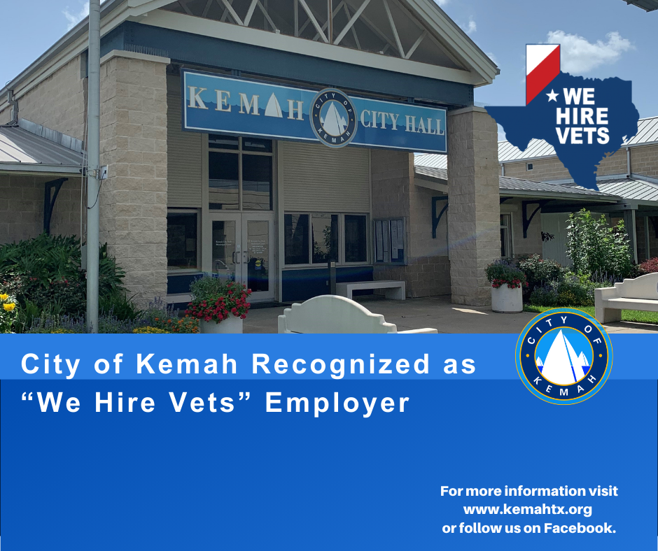 Kemah, Texas — The City of Kemah has been recognized as a “We Hire Vets” employer through the Texas Workforce Commission, in partnership with the Texas Veterans Commission. The “We Hire Vets” Employer Recognition Program acknowledges Texas employers who demonstrate a commitment to hiring veterans and supporting workforce opportunities for those who have served.